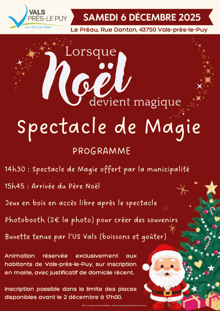 La municipalité de Vals-près-le-Puy organise son spectacle de Noël le samedi 6 décembre 2025 au Préau, rue Danton. Cet après-midi festif, destiné aux familles de la commune, sera placé sous le signe de la magie et du partage.